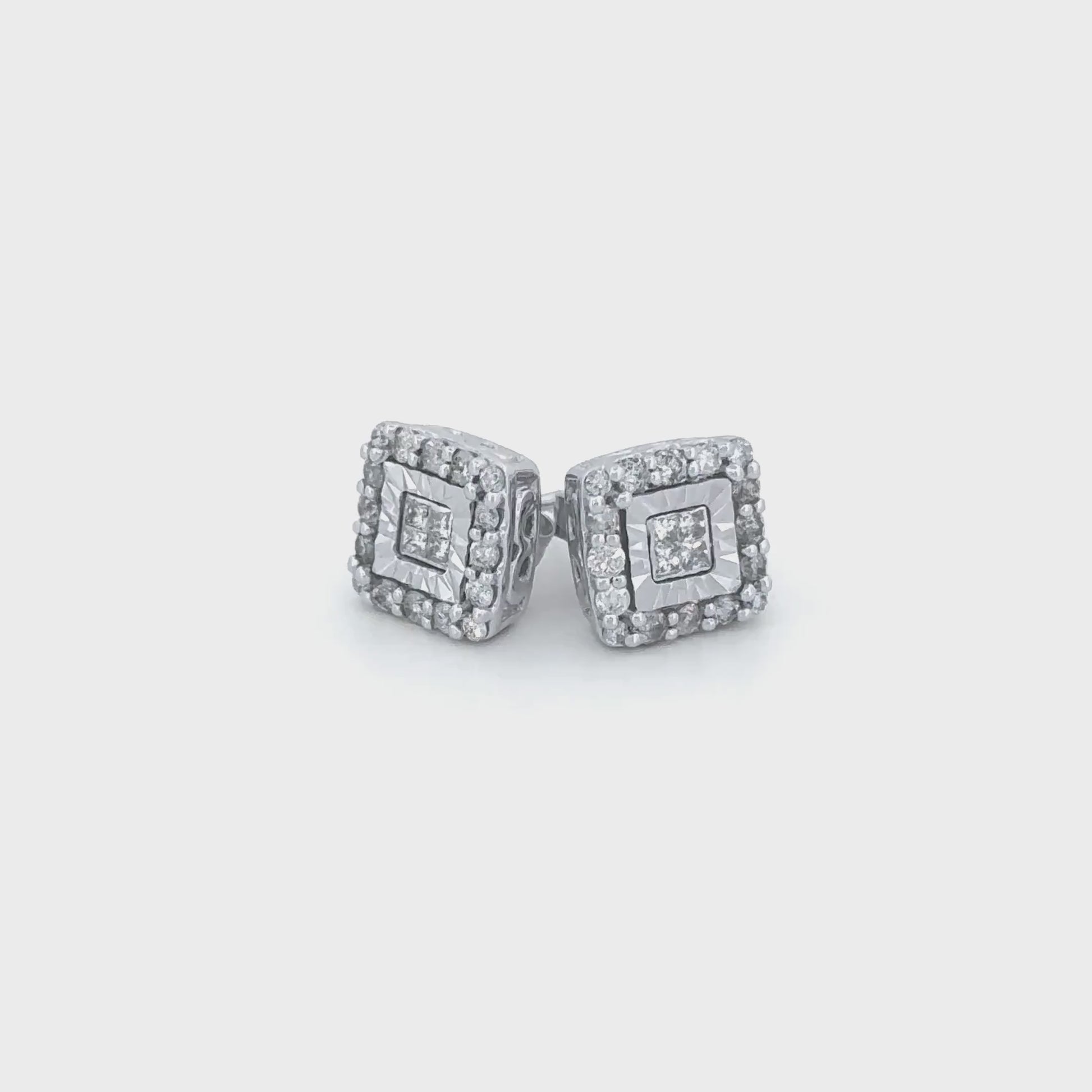 Add a touch of sophistication to your jewelry collection with the Radiant Squares Diamond Stud Earrings. These elegant earrings are crafted from lustrous 10kt white gold, exuding a modern yet timeless appeal. Each earring features a geometric square design, adorned with a stunning combination of princess-cut and round diamonds, totaling 0.60 carats.